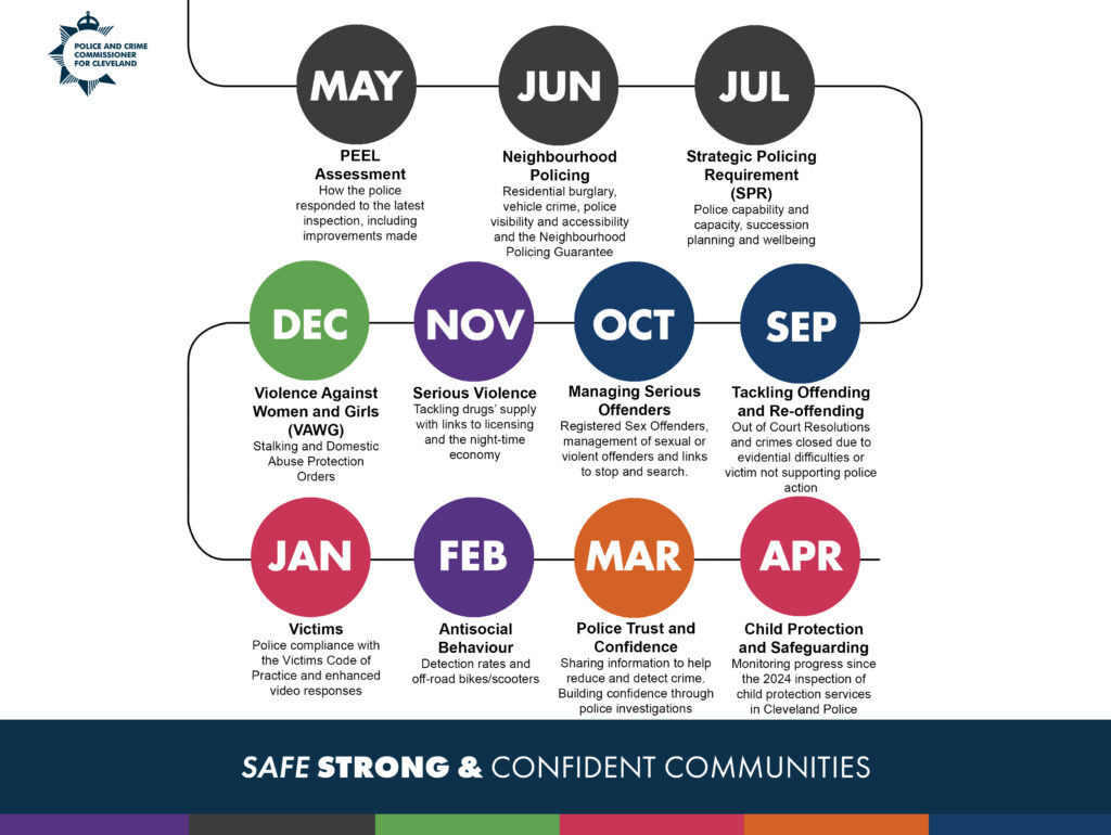 Each year, the Office of the Police and Crime Commissioner (OPCC) develops a Scrutiny Work Programme to shape and guide the PCC’s oversight of Cleveland Police.
